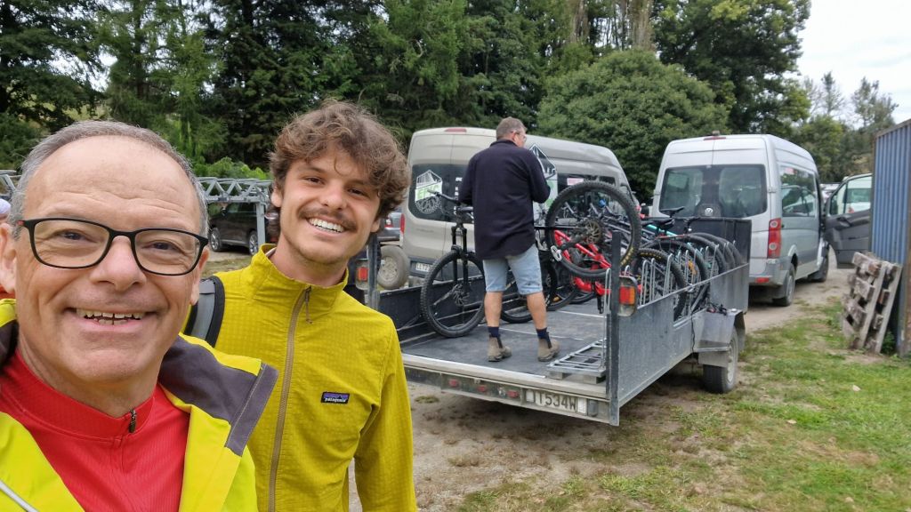 Carreguem les bicicletes a un shuttle que ens porta a l’inici del trail. Aquí és a on tornarem demà.