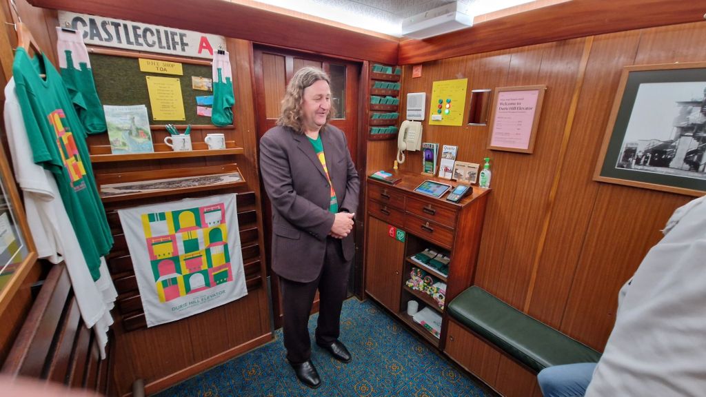 Truques un timbre i ve un ascensor amb el seu ascensorista que mentre puges 66 metres et fa una petita explicació i t’intenta vendre merchandising