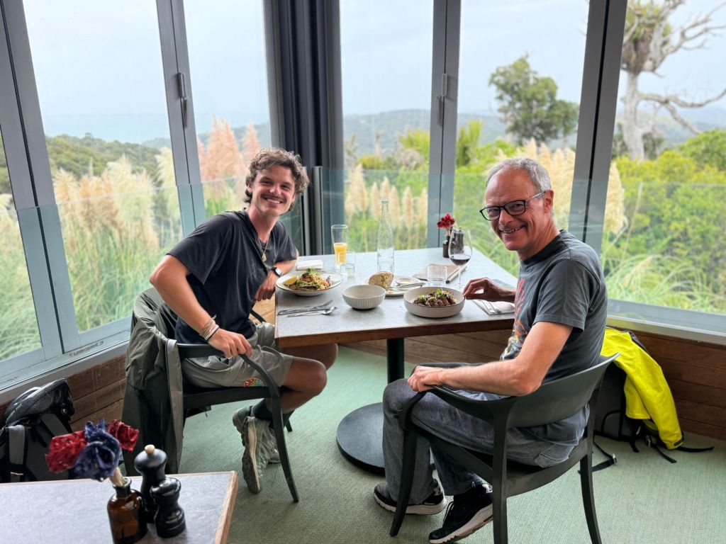 A l’arribar, fortes abraçades del Xavi amb totes i tots els de la bodega. Ens tenen reservada la millor taula del restaurant, amb vistes a Auckland; tot i que el dia no és prou clar per a tenir una visió nítida.